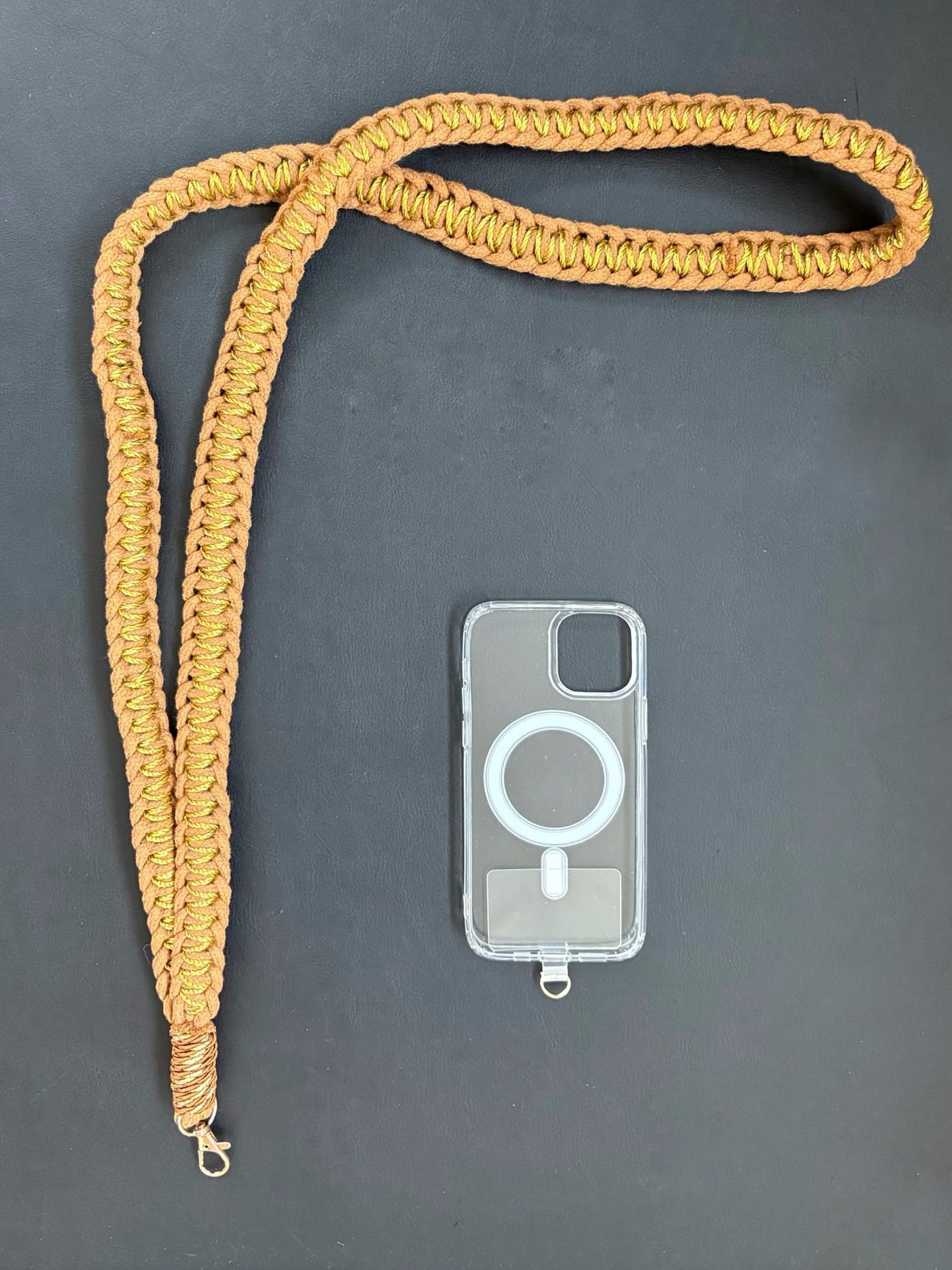 Upplev den perfekta kombination av stil och funktion men våra makramé crossbody mobil rem Arrow. Inspirerad av den avslappnade jeansestetiken är denna rem både praktisk och trendig – perfekt för en aktiv livsstil. Nu finns den även i en elegant brun färg med gyllene detaljer.